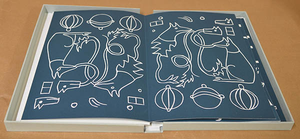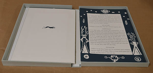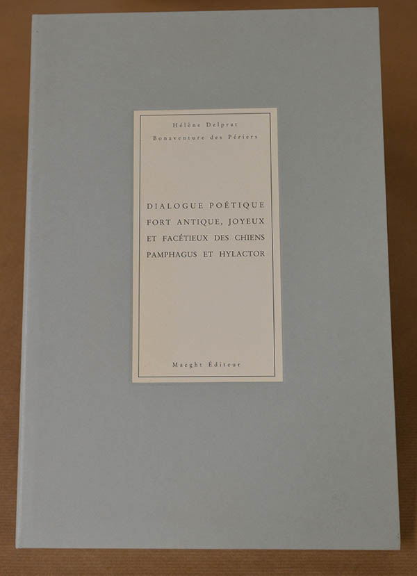 « Dialogue poétique fort antique, joyeux et facétieux des chiens Pamphagus et Hylactor » issu du « Dialogue IV du Cymbalum Mundi de Bonaventure des Périers illustré d’ ornements en linogravure et de six lithographies originales de Hélène Delprat.